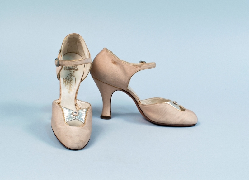 A pair of 1920s evening shoes made of pale pink silk include a delicate detail at the toe: two silver leather wings clasped together by a button. The outer sides of the heels mimic this element with two more dainty buttons. Berg points out that these details were small enough that they would likely not be noticed by people other than the owner. And yet, we are privy to these details, giving us a glimpse into this person’s life.