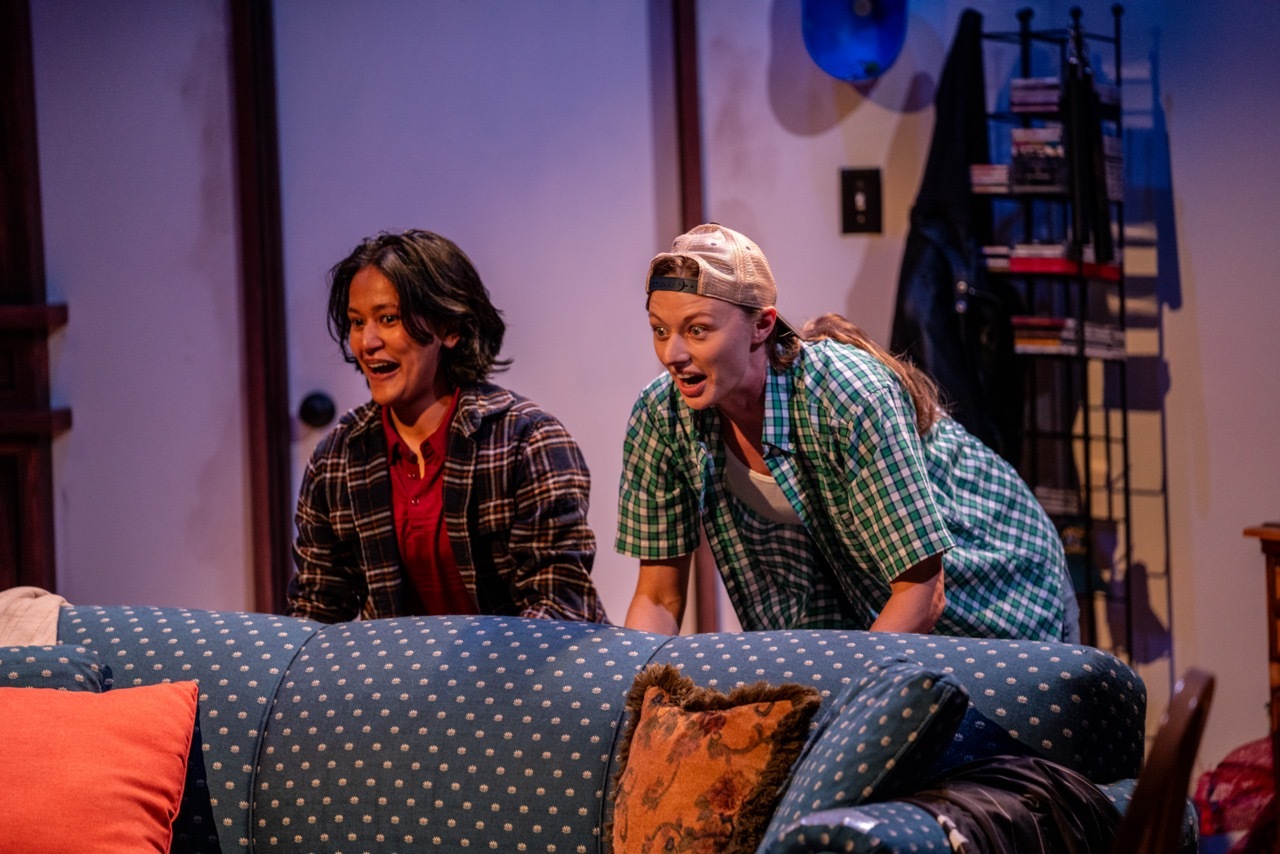 As soon as I walked into the venue, it was evident that Matt & Ben was a highly anticipated show– Kaling’s name was included in all advertising, and ArtsWest’s cozy waiting area was packed full during the play’s closing weekend. As a huge Kaling fan, the excitement was palpable, and only exacerbated by the incredible set design. The set captures a moment in time, grabbing at the essence of a post-college former frat boy’s apartment (immediately revealed to be Ben’s). Food wrappers and boxes are scattered around, shoes left astray, and laundry covers the floor. The mess feels perfectly intentional, which is almost paradoxical, and provided something to marvel at before the play started (even from the left wing, where I watched).