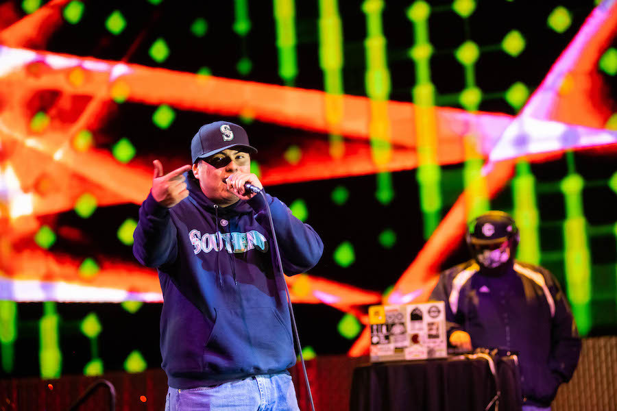 Performances throughout the show set their lyrics as the centerpiece of their songs, as was the case with Aurelio Valdez and Ivan/Melonic in their song “Nepantla.” The phrase “My ancestors, when I’m writin’, I see ‘em, and talk with ‘em” was repeated, along with powerful lyrics in both English and Spanish. As a member of the Latinx community, I found Valdez’s song personally meaningful because it spoke about how the past experiences of our family members impact our lives in many different ways. Simple, dark red graphics moved slowly in the background, not distracting the audience from the fast-paced lyrics but setting the mood all the same.