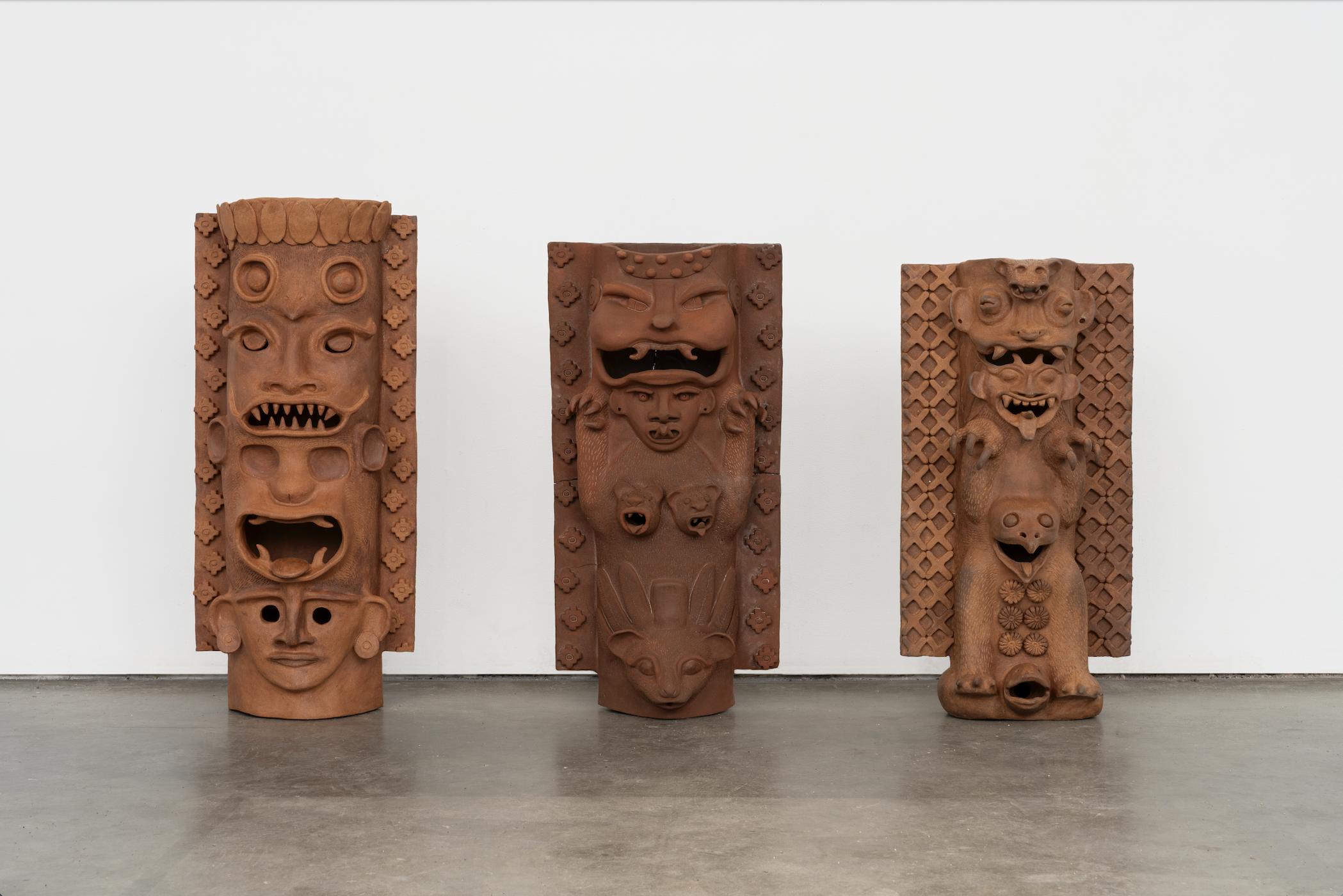 Inspired by ancient Maya protectors, “The Guardians Remind Us of What We Have Forgotten” is a collection of four clay sculptures in the exhibition, positioned in a row on a slightly elevated white platform. Each figure is a mixture of different animals: the antlers of a deer, the claws of a wild cat, the beak of a vulture–all things familiar to viewers but combined in a way that makes them seem mightier. In Maya culture, certain animals are regarded as guardians of the land and its people. Dobler Dzul has taken the traditional idea of these guardians and created new ones. Blending ancient culture with modern context, she calls on these age-old creatures to protect current waters and lands as they are threatened by environmentally disastrous projects like Mexico’s Tren Maya: a train nearly 1,000 miles long that traverses through five states in southeastern Mexico. The train has caused major deforestation in protected areas, destroyed cave ecosystems, and forced many local communities to relocate. Similarly, in Tacoma, Washington, underground water sources have been contaminated due to continuous industrialization. Dobler Dzul has created art that spans centuries, looking both into the past and into the future.