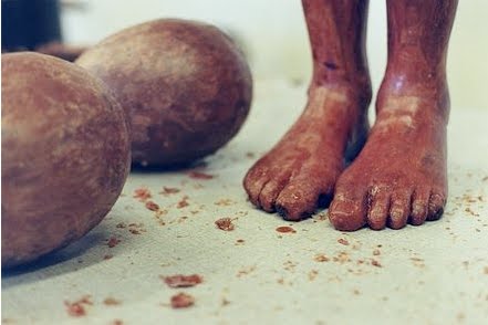 SanpakuEventually I focus on developing my own interpretation of Smith’s works rather than guessing her thoughts behind her art. One place that is meaningful to me is a group of photographs each titled Untitled (Eve). The first image depicts the top of a female statue’s head and her hand reaching up from the bottom of the image. The second depicts the statue’s feet. The third depicts the statue’s face looking at something unseen by the audience. When observing these photographs I feel I am missing what the statue wants me to see. Each time the photographer only reveals a small part of the statue (concealment of the whole is a motif in Smith’s exhibit). For me, the three Untitled (Eve) images represent the voices of many women who have tried to be heard but have not succeeded.