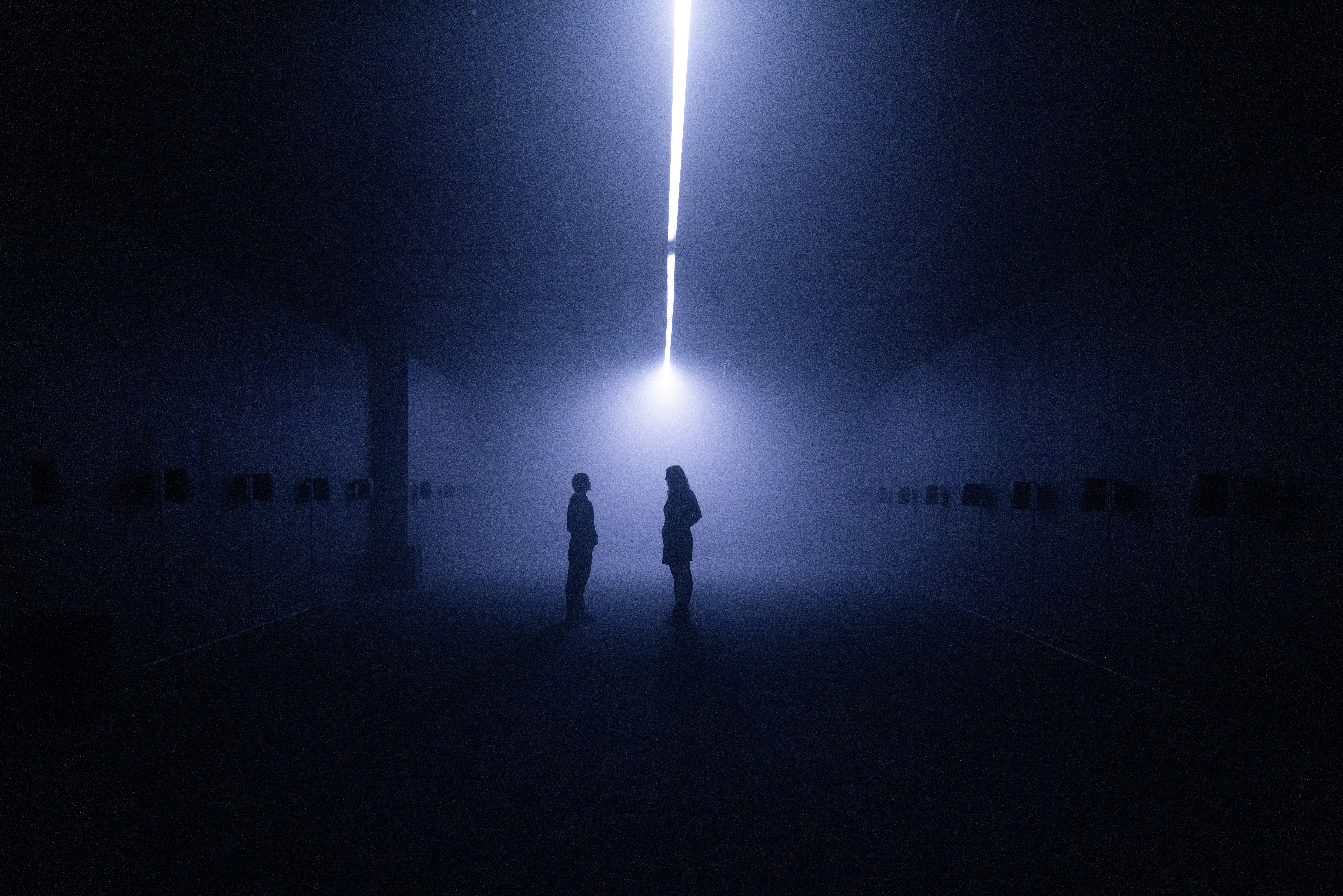 Then the lights came up, sort of. FLÓÐ is lit by a single strip across the ceiling, which darkens and brightens and undulates in time with the sound, which is composed by Jónsi and evokes the ocean without really sounding like the ocean. Instead of the crashing of water, it’s made up of choral recordings and vaguely electronic sounds, but it moves up and down like a wave. Sometimes the music and the lights are regular and rhythmic, like a calm sea, and sometimes storms seem to sweep through. Occasionally, the pitch darkness returns.