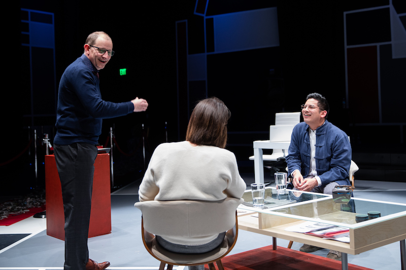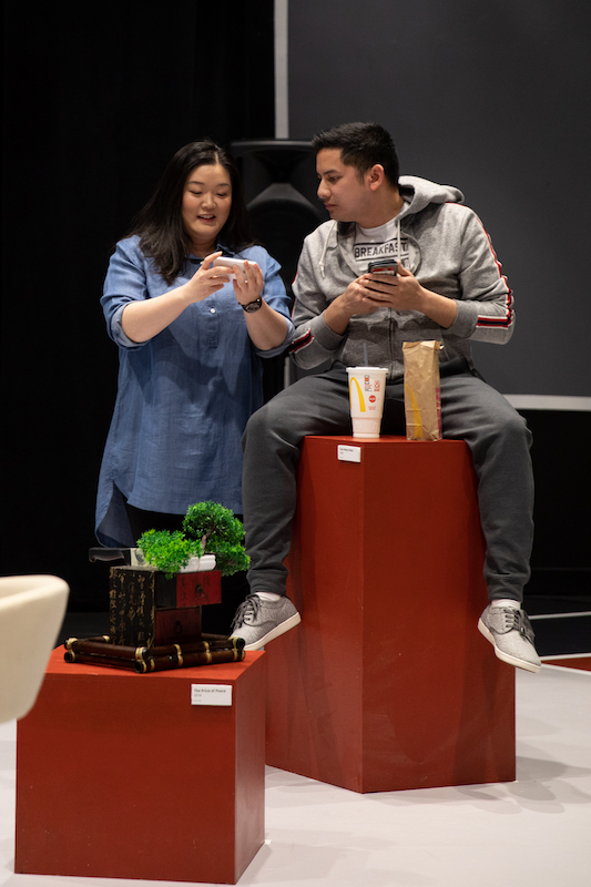 Walking into the theatre space, I step onstage to observe a small arts gallery, consisting of everyday objects that hint at the push-and-pull dynamic between Chinese and American culture. The performance begins with a TED talk-esque speech by dissident artist Lin Bo (Justin Huertas), who describes how the post-Tiananmen climate in China had inspired him to set up an imaginary protest against the Chinese government—an act that ultimately leads to his imprisonment. Before we know it, Chen seamlessly switches the setting to that of a journalist’s office, where Lin Bo is questioned again and again about his imprisonment, until the truthfulness of his account unravels. Chen shifts the scope of the performance yet again; now, two performers (Jonelle Jordan and Narea Kang) act out an artist’s interview that explores how truth and lies manifest in our culture. Chen changes the location once more, to a scene “after the show” where two actors discuss their motivations for creating CAUGHT and come to realize that they had been lied to by someone they had thought to be truthful. By the end of the performance, we are left questioning the authenticity of stories told by journalists, historians, and artists alike. What we believe to be the truth is simply based off the stories we hear and share all around us.