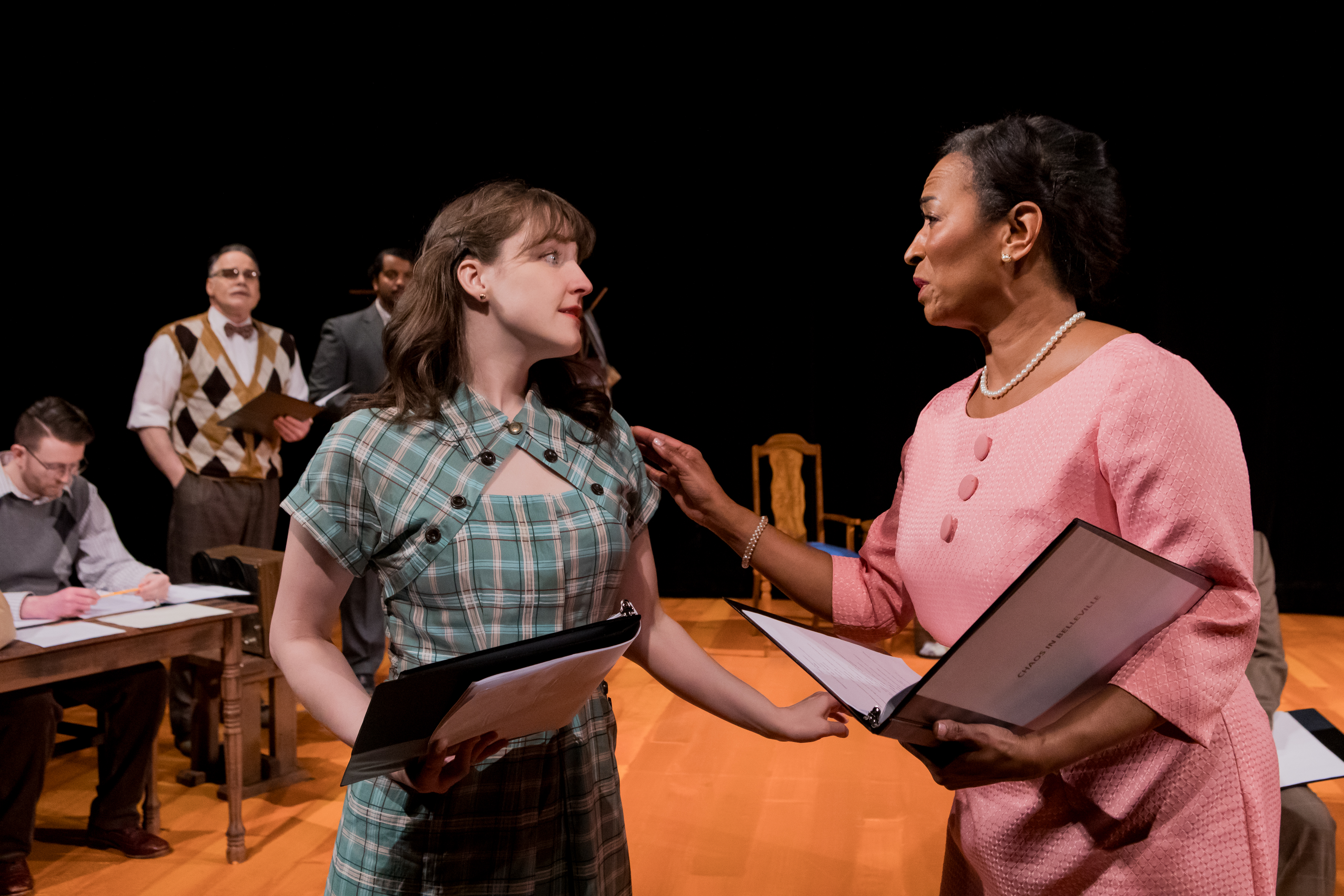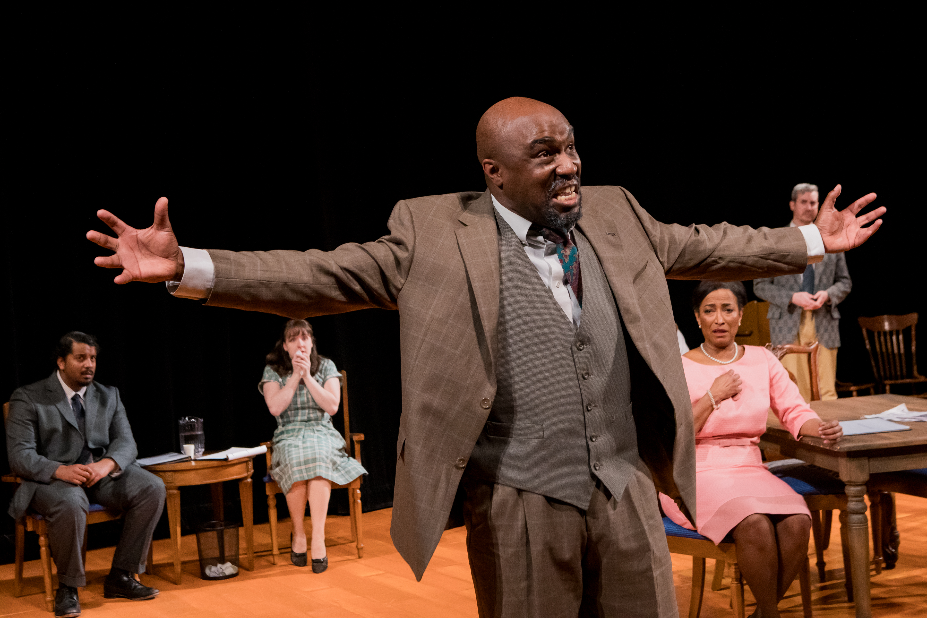 The intimacy of the location adds to the immersion and makes the play feel different than many period pieces; art from the 1950s can often be seen as dated due to the subtle historical barrier that black-and-white film or photography creates or topics that are now in the past. However, the theater medium is tangible and free from this deceptive separation. The proximity to the actors in such an intimate venue alters one’s perception of the story; you feel like you could be in the room with the characters, observing and not interfering with the conflict in front of you. In the direction of the play, there are no overbearing ‘50s references or stylistic elements, subsequently producing a timeless feel that highlights content’s relevance. The visual design is simple and appropriate for the setting of a rehearsal space; the sparse uses of technical effects intensified their impact, subtly separating those scenes from the realistic rehearsal.
