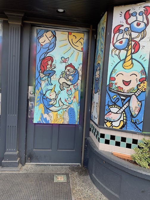 The above mural is displayed in front of the restaurant Coastal Kitchen. This mural falls into the second category of art I mentioned above. It is a colorful, dynamic, cute illustration of anthropomorphic creatures doing their thing in a lovely seascape. When I saw this, I had a feeling of warmth. I was momentarily elated by this banjo-playing narwhal. Despite its lightheartedness, art like this has power.