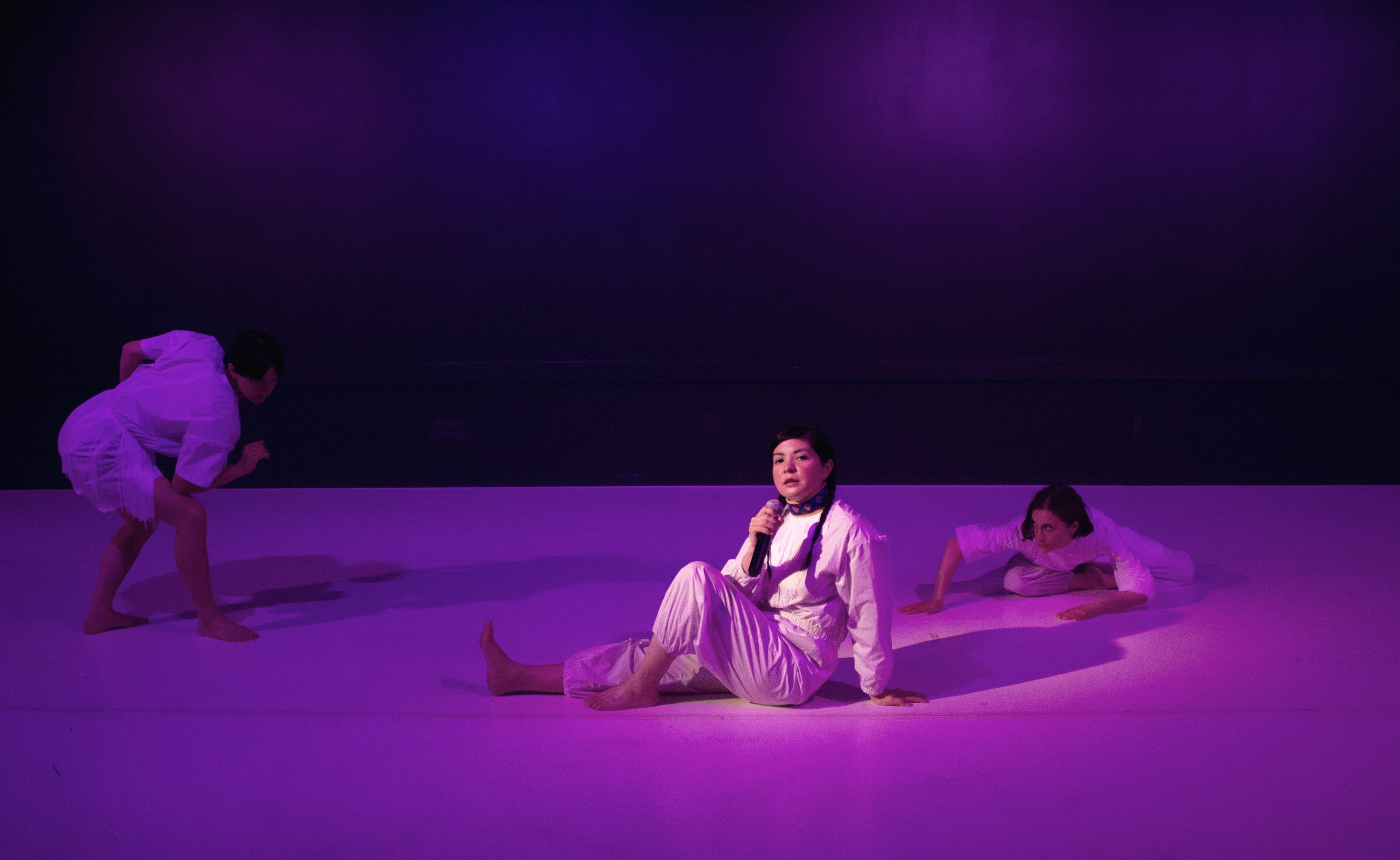 Radio III is a contemporary dance and music performance created by Elisa Harkins, Zoë Oluch, and Hanako Hoshimi-Caines. The piece explores themes of colonialism, and the cycle of life in the past, present, and future through an Indigenous lens. The dances and score portray an Indigenous reaction to the way colonialism affects the way we think about life, death, and the limits put on our perspective. The show’s venue, On the Boards, was an excellent fit for the nature of the performance; the stage is minimalistic in a way that directly complements the performance. Walking into the theater, an open-white space and a foggy haze in the air greets the audience, welcoming us into a dream-like state.