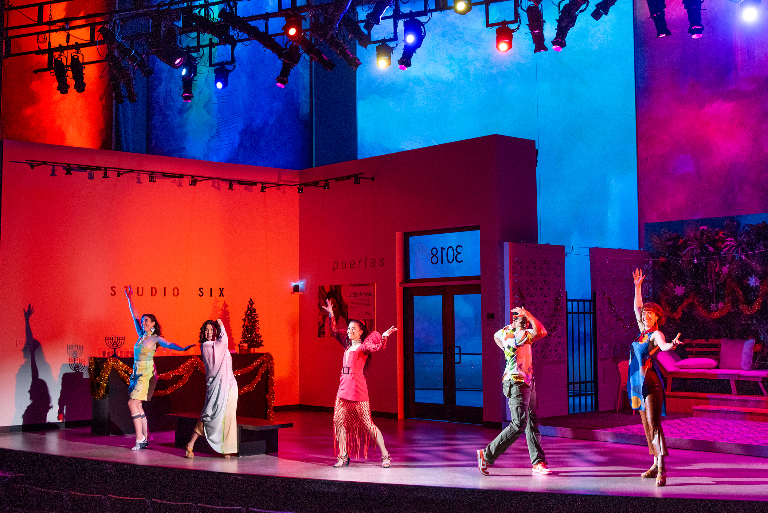 Lead photo: Beth Pollack, Diana Burbano, Cheyenne Barton, Diana Garle, and Gabriell Salgado in Laughs in Spanish (2025). Scenic Designer by Sara C Walsh. Photo by Sayed Alamy.