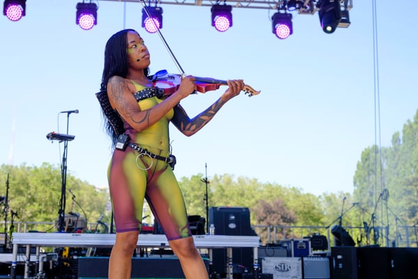 Another festival highlight was experimental electronic/R&B artist Sudan Archive’s performance. I noticed that there weren’t that many people in the crowd, but that may have had something to do with the fact that she performed earlier in the day, at 3:45. Wearing a leather harness over her green bodysuit that was attached to her violin, she sang, danced, and fiddled her heart out. On stage, Sudan Archives talked about coming up and her challenges in the music industry, before getting down to the media section in front of the stage and interacting directly with audience members, touching hands, locking eyes, and dancing with people in the audience.