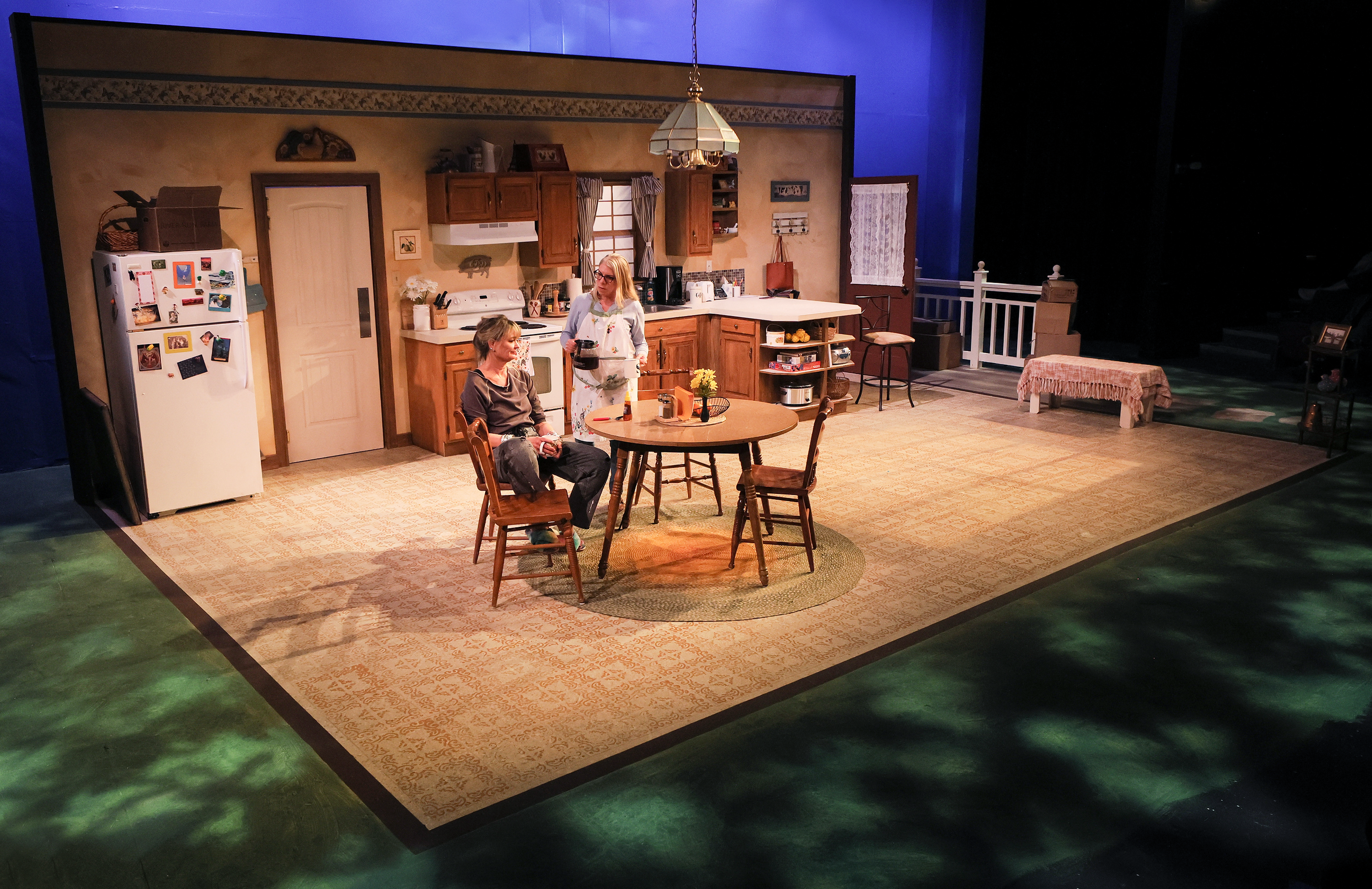 The distinct changes in lighting from day to night – by lighting designer Jacob Viramontes – signify the characters’ unfamiliarity with each other. As we become familiar with the story, blinding daylight fades as night comes. Blue lights focus on the kitchen, giving a more mysterious tone as Robyn goes to bed and Sharon stays downstairs, cleaning up, excitedly awaiting what tomorrow has in store. This story isn’t just new to the audience, it’s new to the characters too. Both women are starting new lives—one way or another.