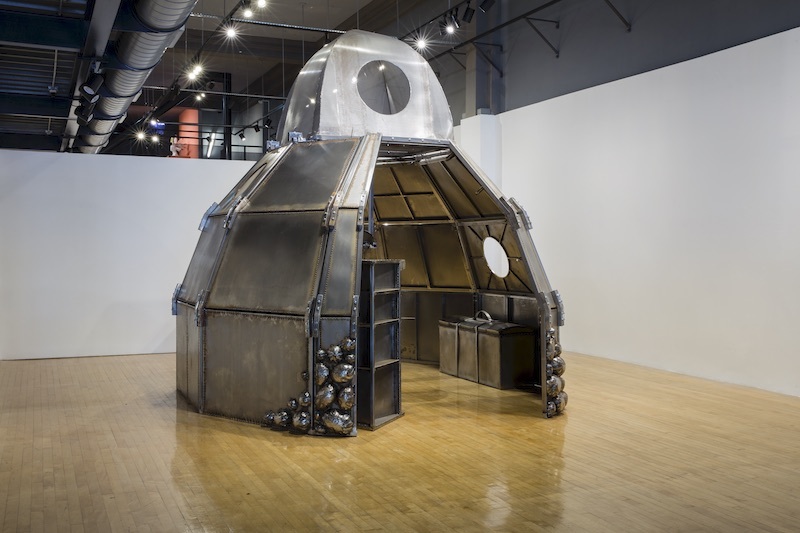 Beatriz Cortez’s Memory Insertion Capsule is a striking metal space capsule arranged for viewers to walk through. Cortez uses sculpture (metal rocks on the outside of the capsule evoke Central American architecture) and video (a small screen shows archival materials related to the United Fruit Company, notorious for its corporate colonization of Central America) to educate viewers in a process Cortez describes as implanting memories of colonial injustice, as if the viewer had experienced that history themself.