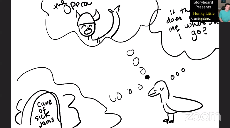 The best moments of the performance adapted advantageously to the digital medium. The first comedy duo, The Appropriate Ladies of Weatherbee, used Zoom backgrounds to transport themselves to an ambiguous, old-timey England. The backgrounds helped the scene work in a way not possible in-person, complimenting iconic, off-kilter lines, such as, “I do love to crush a small bug between my fingers from time to time”, and “Mildred, I believe your goat is the devil incarnate.” The next team, Price Nixon, used backgrounds varying from Tiger King screencaps to a Third Eye Blind concert and Trolls: World Tour. Up next, Beckz and Mads filmed in their bathrooms, playing beauty vloggers stuck in Vegas due to a cancelled convention, being legally obligated to film YouTube videos from their hotel rooms. A delightful finale, Storyboard, featured live cartooning, music, and an improvised Choose-Your-Own-Adventure storybook. Storyboard served as delightful proof quarantine doesn’t have to tamper art, and leaning in to adaptation can create something wonderful.