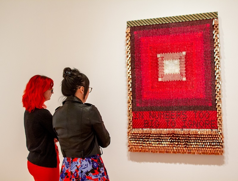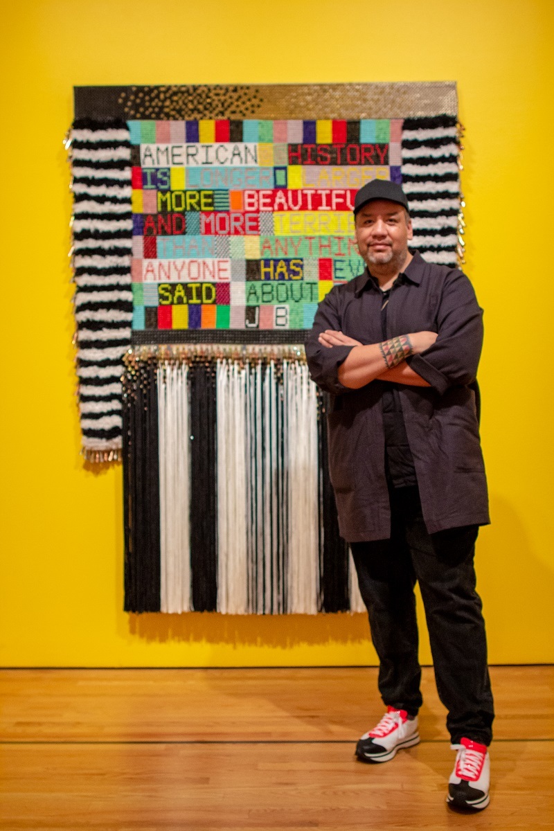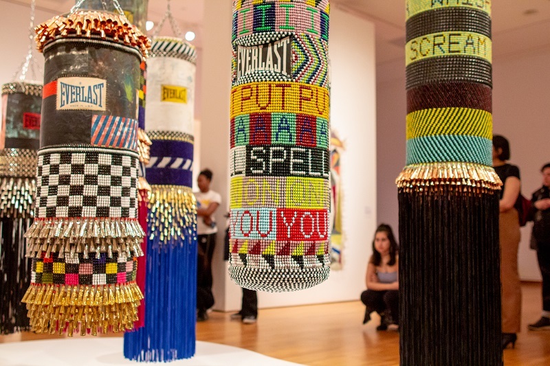 Jeffrey Gibson’s loud, emotional, and thought-provoking exhibit "Like a Hammer" is filled with pops of color, ornate beading, chaotic shapes, celebrations of Choctaw-Cherokee culture, and nods to the LGBTQ+ community. Gibson creates a space for viewers to celebrate what makes them different and recognize the hardships society creates.