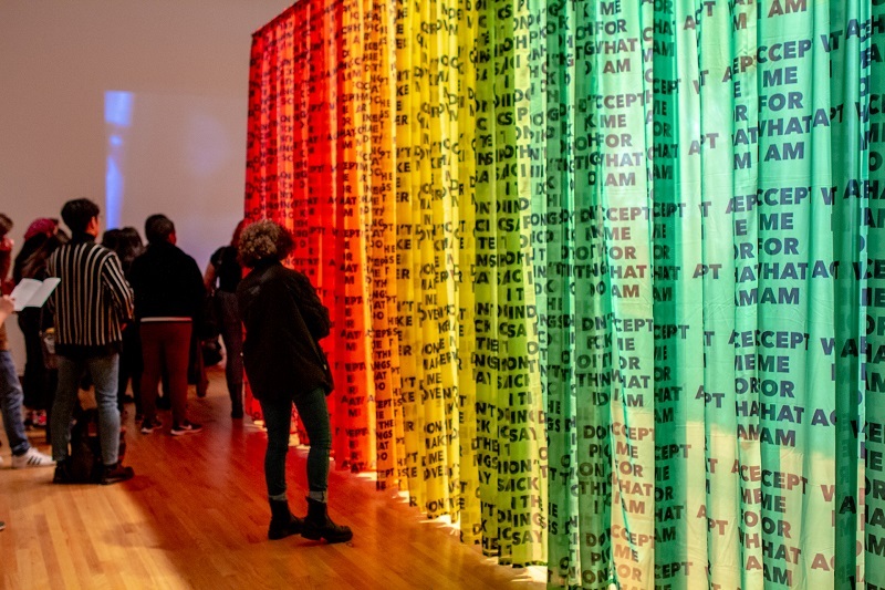 Gibson also pulls from pop culture, incorporating quotes from others into his beaded canvases, such as the James Baldwin quote Gibson paraphrases: “American History is longer, larger more beautiful and more terrible than anything anyone has ever said about it.” This culminates with the experimental and raw "DON’T MAKE ME OVER" mentioned before, a thin curtain in the colors of the Pride Flag covered in phrases including, “DON'T PICK ON THE THINGS I DO,” DON’T PICK ON THE THINGS I SAY,” and “ACCEPT ME FOR WHAT I AM.”