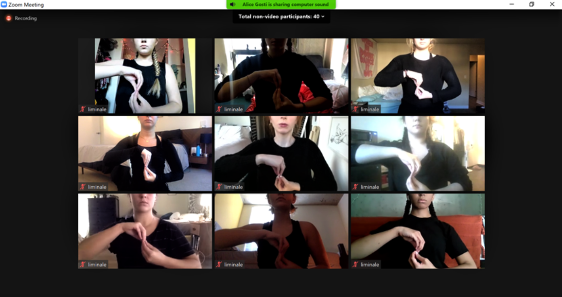 Critically acclaimed and award-winning choreographer Alice Gosti sought to transform the boundaries of Zoom into new horizons by expanding the reach that dancers had in their own homes. As viewers, we experimented with Zoom’s multitude of features, switching back and forth between viewing the dancers through gallery or single speaker mode. It was interesting to play around with these features and to see where I wanted to focus my attention the most. I found that I liked the gallery more, as I could draw parallels on all the dancers and their synchronous movements all at once.