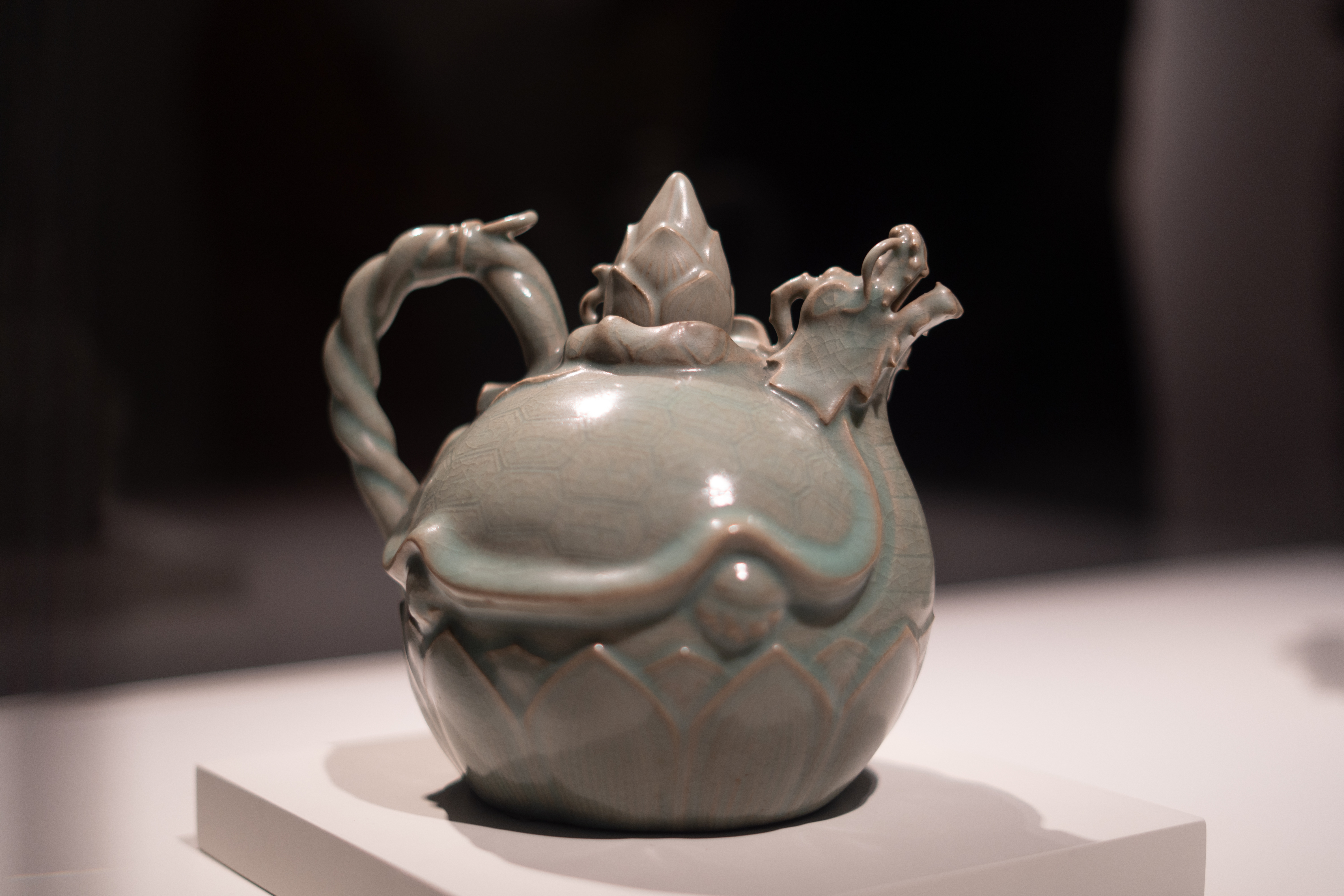 Meot’s design is very intentional. Many of the featured artists emulate techniques and elements from the Korean Joseon dynasty (1392 - 1897), from the use of cobalt and white slip to implementing traditional calligraphy, symbolism, and even poetry. The exhibit’s curator, Hyonjeong Kim, is deliberate in her layout design; contemporary pieces are placed adjacent to traditional Joseon dynasty pieces, juxtaposing the time period while simultaneously emphasising the common motifs and influences. One of the exhibit’s stand-out pieces, Younsook PARK’s towering Moon Jar, directly imitates the Joseon “moon jar,” using traditional methods to replicate the pure-white harmonious form. The exhibit places traditional Joseon moon jars in close proximity, allowing the viewer to directly observe the influences and emulated techniques.
