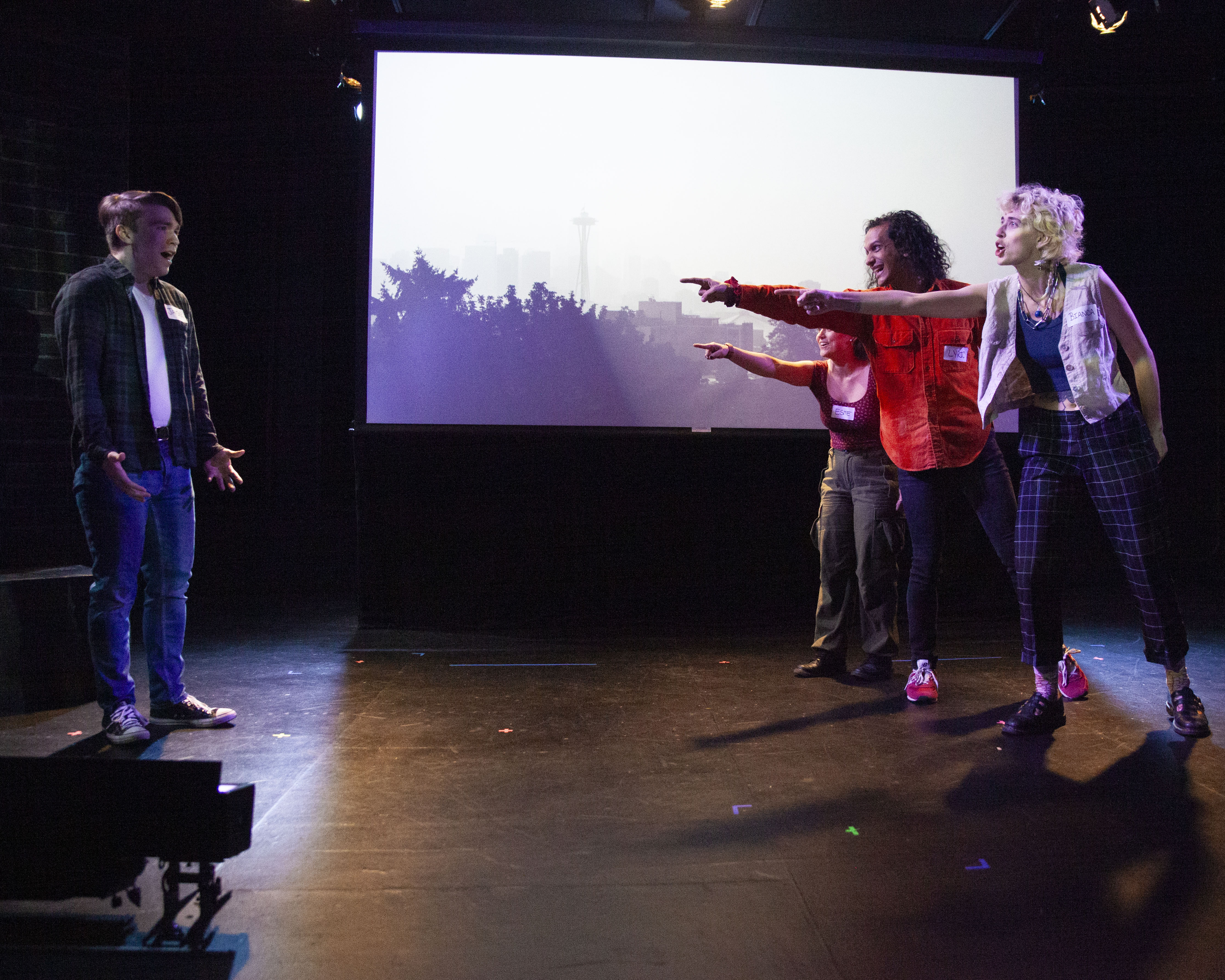Such is the case with Emerald City Slasher. This Jet City Improv production in the intimate West of Lenin theater transports audiences to the very familiar, coffee-addicted, and perpetually rainy Emerald City. The improvised murder mystery follows eight friends who are struck by tragedy once one of them falls victim to a gruesome murder. As friends are picked off one by one, they race to find the culprit before they themselves are slashed. In the first scene of the show, actors pick up cards. These cards describe characters created by audience members just moments before. The card also tells them whether they are a survivor, a victim, or… the Emerald City Slasher! No one in the cast nor crew knows anyone’s true identities until the final scene where the slasher is uncovered. My cast included characters such as Danielle, a timid zoo keeper with a fascination for mysticism; Bobby, a failed beer brewer who loves a good laugh; and John, a gruff man opposed to change, working as a window wiper at the Amazon Spheres. The improv nature of the show gives a unique authenticity to the mystery, but unfortunately makes for an unsteady first act.