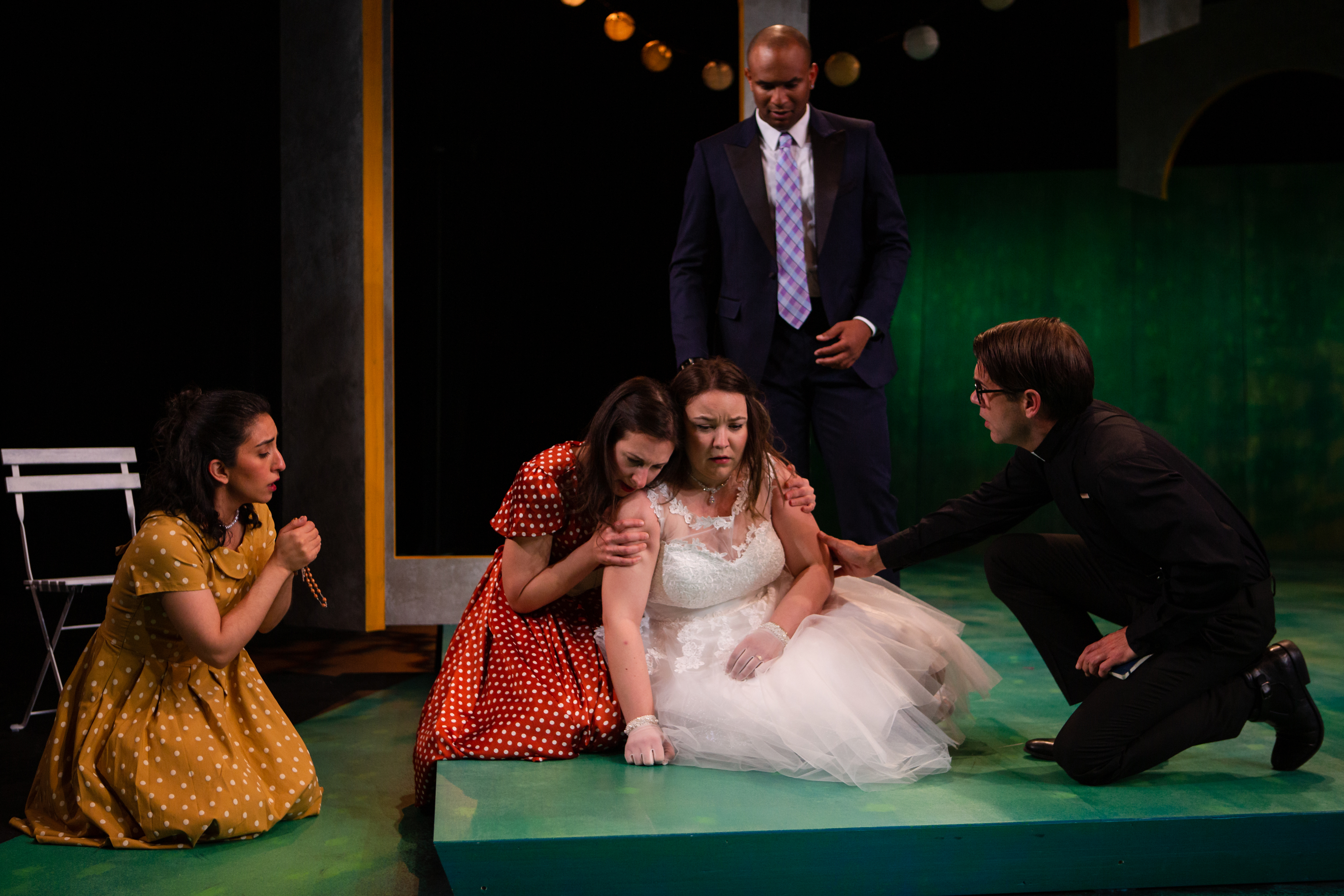 Regardless of my qualms, the casting and the directing shone in the second act. After Hero has been left at the altar and slut shamed, she fakes her own death to free herself from the rumors. Highlighting her heartbreak and the cruelty of the situation, she sobs in her wedding dress with friends surrounding her. Hero’s arc is concluded when Claudio unknowingly proposes to her in an effort to make things right with her family. When she reveals herself, Claudio falls flat on his stomach, silently begging for her forgiveness. This was the moment where the previous lack of objective revealed a poignant climax, as every character on stage waited for Hero to make her choice. The silence on-stage reveled for an agonizing moment. Only at her nod did the scene continue. It was these little character choices that asserted Hero’s agency throughout the show.