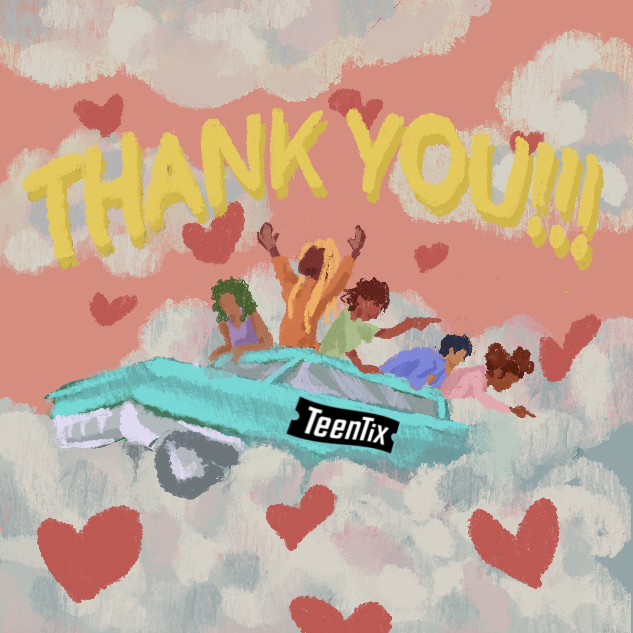 “Very few flyers or graphics stand out to me: some are too dull in color, some are too bland in the shapes they employ. But an organization like TeenTix deserves to stand out, so I set out with the intent to create a vibrant flyer that would instantly invoke joy in the viewer. The result is this graphic: one depicting a band of youth of color as they excitedly explore the world, suspended in the clouds. Like the magical car that the teens fly in, TeenTix is a vehicle for youth to go to events and receive opportunities that would otherwise be inaccessible and unattainable (I speak from personal experience). The impact TeenTix has on the lives of numerous youth can only be attributed to the community who makes it possible, so I portrayed one particularly energetic teen splaying their arms out in a gesture of gratitude. Each heart drawn into this graphic represents a friend I've made in this community, especially those who continue to inspire me with their commitment to arts equity. Thanks, TeenTix, for opening doors in the arts for me!” - Esha P.