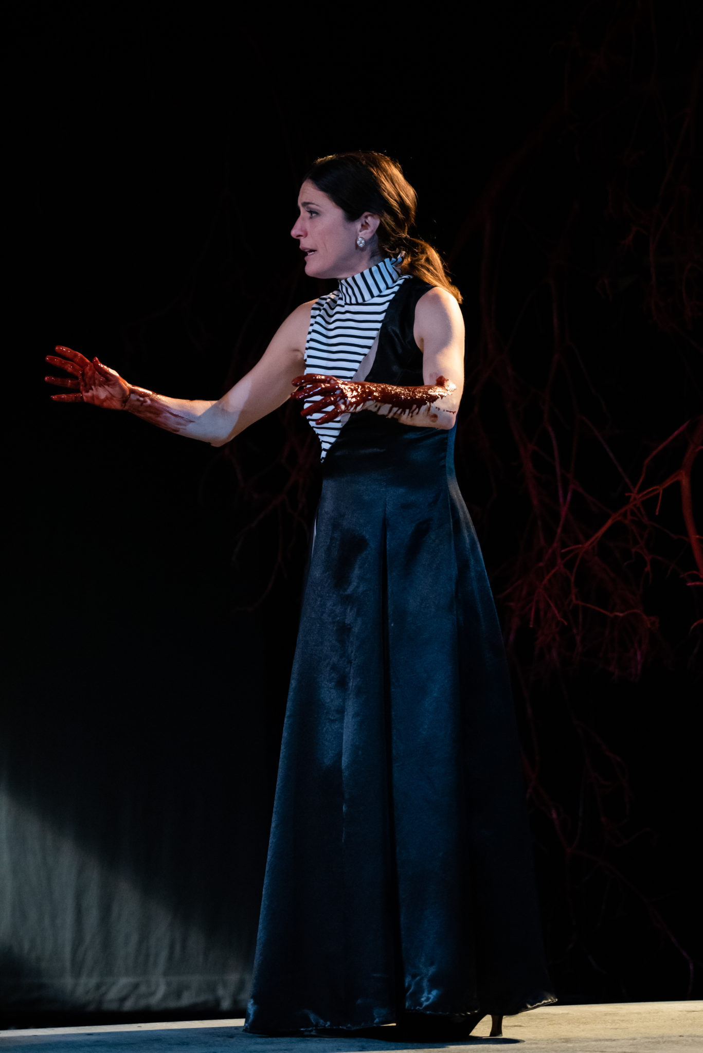The use of blood throughout the play was also intriguing. The blood in Macbeth represents life, death, and, most importantly, the stain of guilt. Used in nearly every scene, characters would often have their hands or arms covered in blood. In the first act, blood drips out of a dying man’s mouth as he sinks to the ground; his blood keeps him alive until his last moments. This was the first use of blood within the play, and the use of it in a seemingly unnecessary place sets the stage for it to be a highlight of the show. Later, Lady Macbeth turns on a faucet during a fit of insanity. Blood pours out, completely covering her. This scene symbolizes her guilt and how she can never escape it. Lady Macbeth feels entangled and trapped by what she has done, and the excess of blood shows that. After Macbeth murders Duncan, he emerges onstage drenched in blood. This use of blood exemplifies his guilt and shame for what he has done. In his search for power, Macbeth has let himself become corrupted. When he attempts to remove the blood, it is stubborn, illustrating how his guilt and shame can never truly leave him. Even when he manages to wash away the blood, it soon returns, showing how he can never escape his past. In the last moments of the show, Fleance (Hersh Powers) stands under Macbeth’s severed head and gets drenched in his blood. I’m not sure why he did this, it could just be an unusual director’s choice. Either way, blood is a very prominent motif throughout the play.