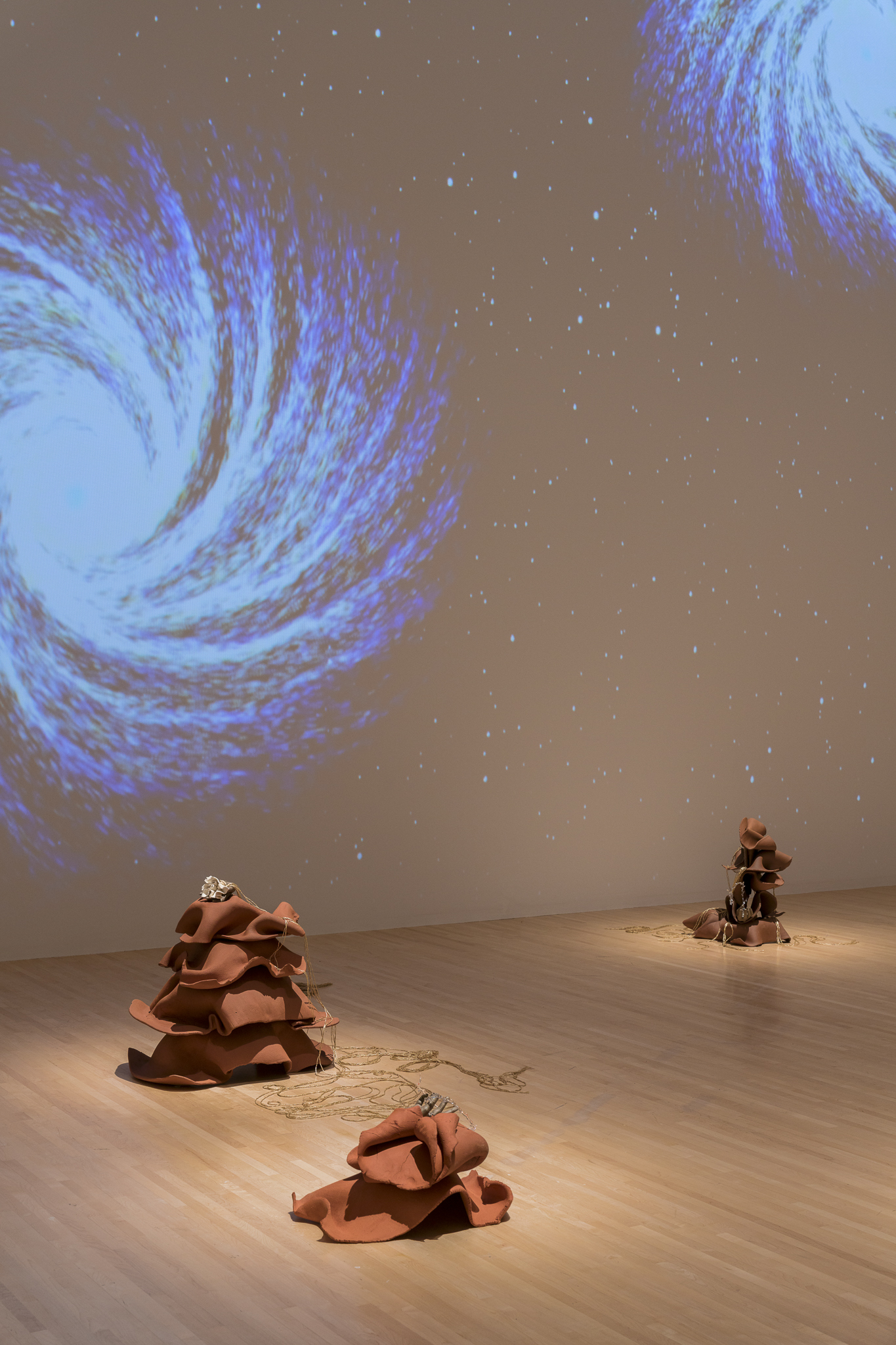 The exhibition can be found on the bottom floor of the Henry, taking up a sizable portion of the space. Visitors are encouraged to walk amongst Akashi’s sculptures, carefully displayed across the gallery space. These sculptures are not displayed on pedestals or behind glass as in a traditional gallery but are rather placed directly on the floor. The proximity to the art makes the viewer feel as if the sculptures they are encircling and studying are merely other members of the crowd. The sculptures themselves are mounds of clay, carefully folded in a way evocative of the very earth the clay came from. Many of the sculptures are topped by bronze casts of the artist’s hands; some hold folded flower-like items, others coiled ropes, and others delicate blown-glass branches. Along the walls of the space are prints of Akashi’s work, showing a unique form of photography in which crystals are grown on film. Finally, projected across the back wall of the gallery is simulated footage of the collision of the Andromeda and Milky Way galaxies, creating an optical illusion as the back wall appears to expand, making the viewer feel miniscule in comparison.