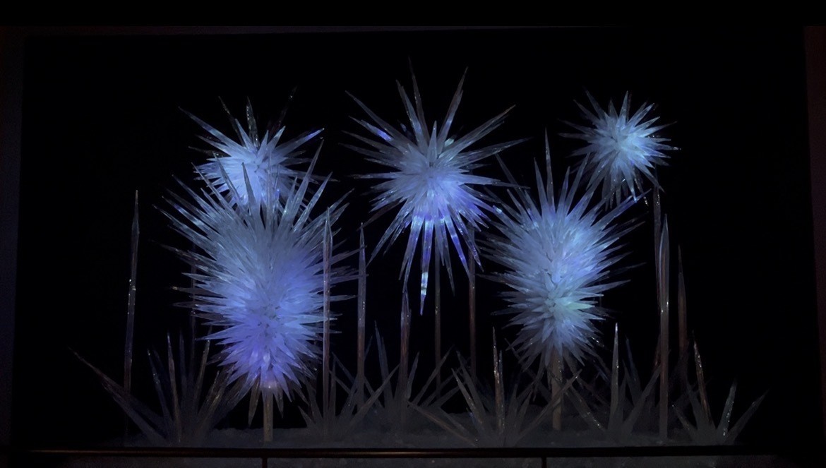 The journey through the museum was truly an adventure, in the way that each turn brought something completely new. Each exhibit had its own unique atmosphere, showcasing the glass art in a different way. The Sealife room centered a huge sculpture representing the Puget sound surrounded by smaller pieces of different underwater elements. The Chandelier room showcased detailed colorful sculptures hanging from the ceiling, each one different from the next. Winter Brilliance highlighted clear, spiky pieces manipulated by colorful lights, conjuring the image of icicles in the winter sun. The variety shown throughout really highlighted Chihuly's versatility as an artist, as well as the versatility of the medium. Glass is essentially a clear, blank canvas, but he brought it to life through shapes and color, conveying complex meaning and sparking emotion in every piece.