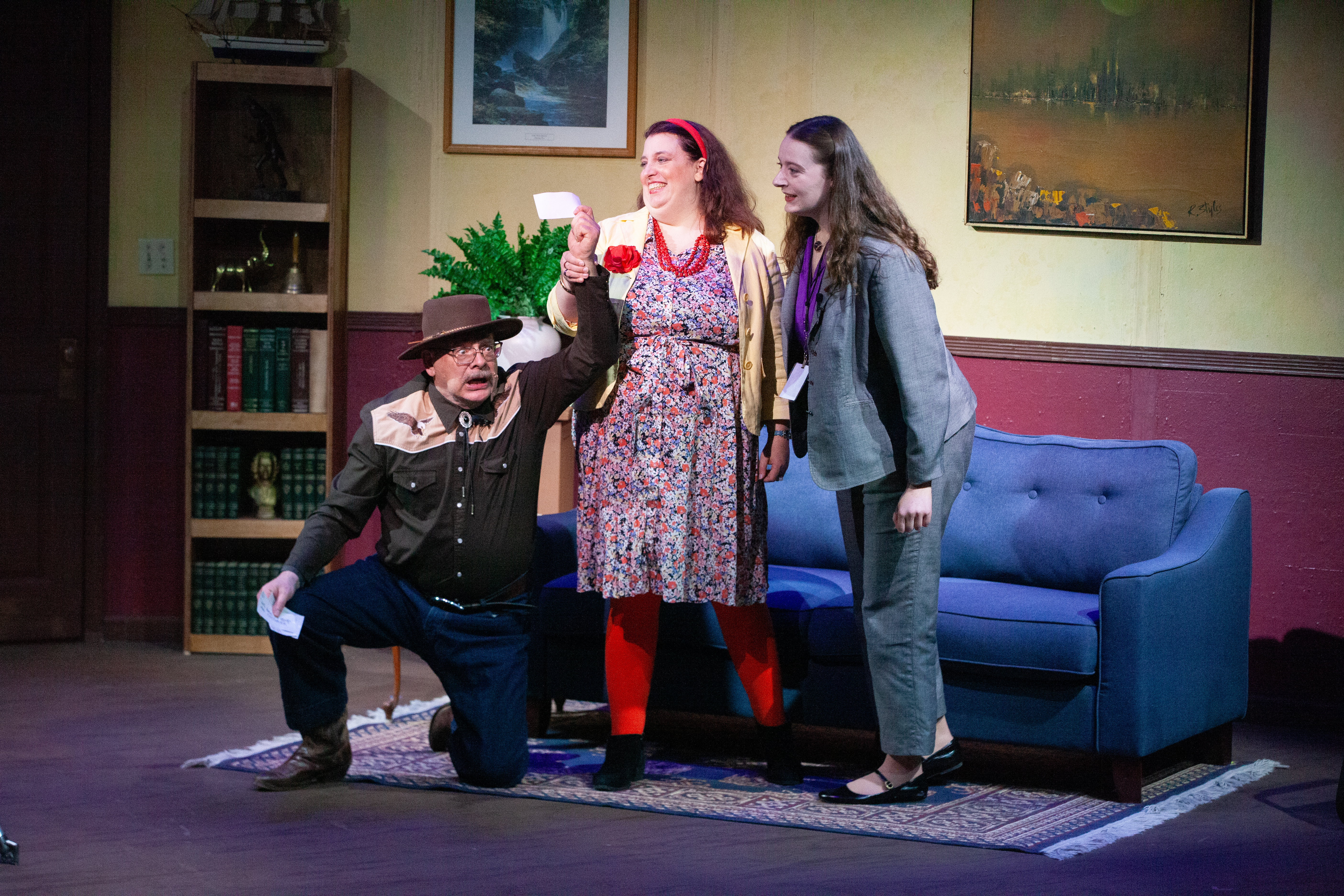 Lead photo: Doug Knoop (A.C. Petersen), Keith Dahlgren (Ned Newley), and Joy Ghigleri (Rachel Parsons) in The Outsider. Photo by Dale Sutton.