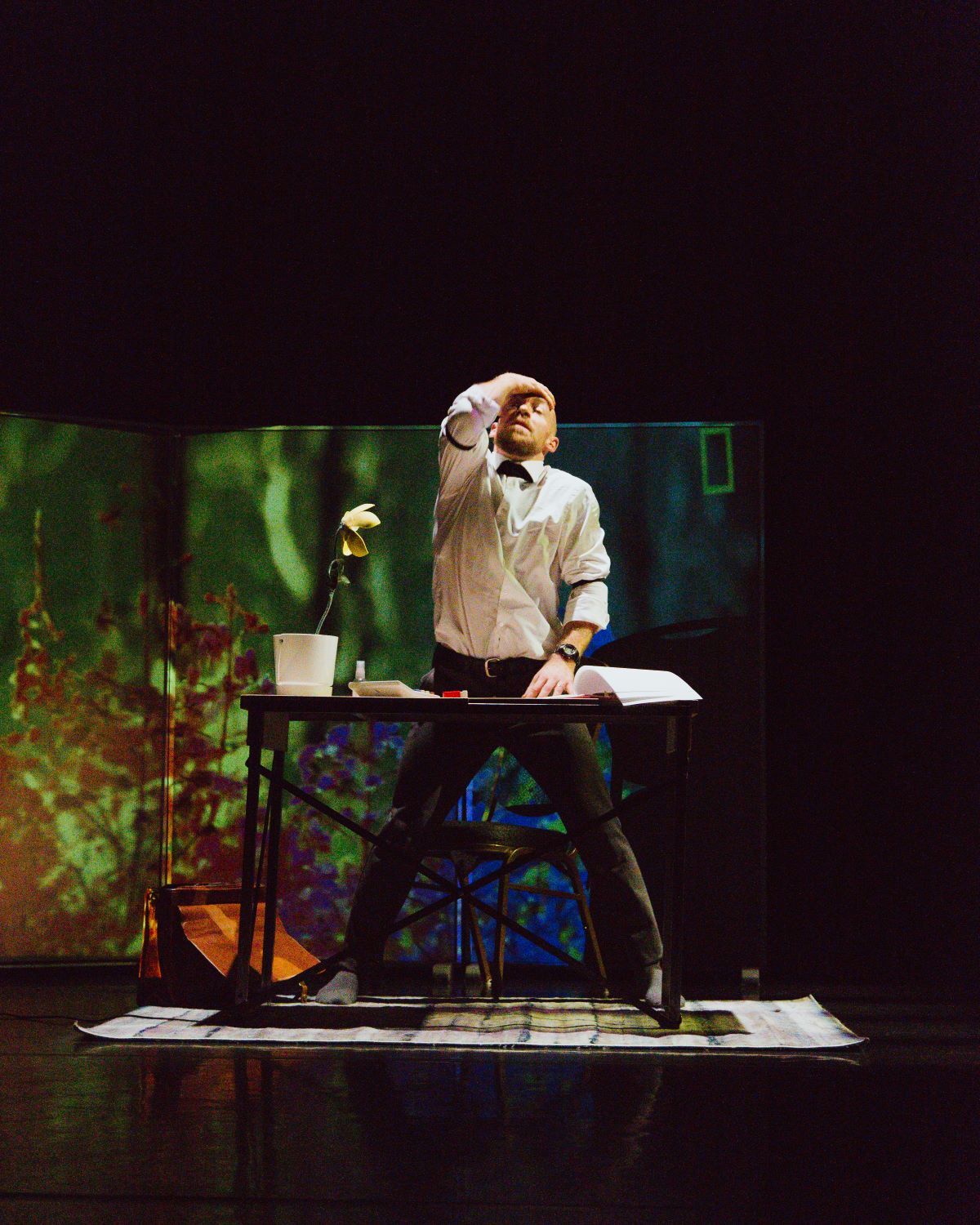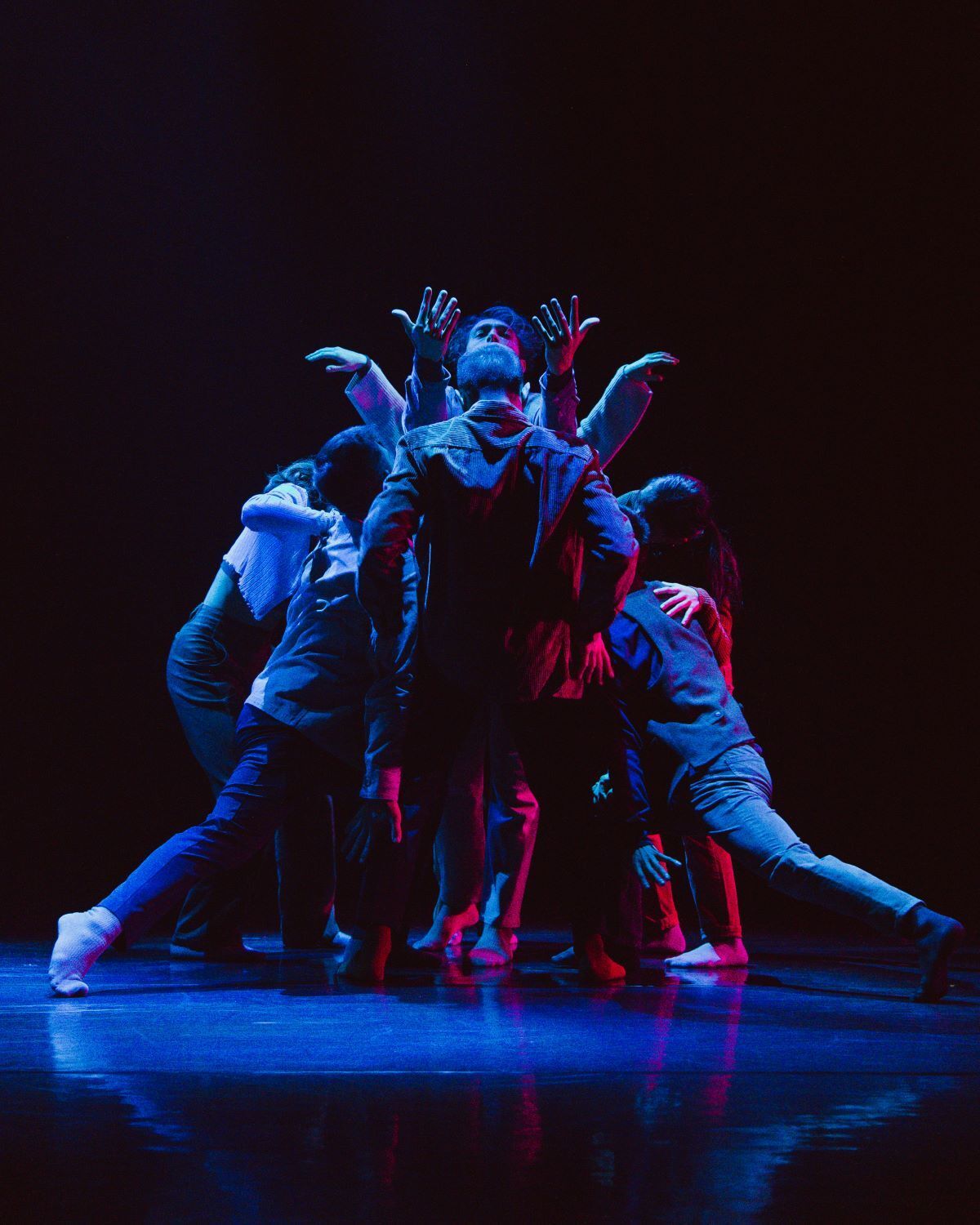 That’s not to say it was overall unimpressive or even unmoving—many scenes, especially those featuring the ensemble (the seven performers aside from the man at the desk), stood out for their clarity and beauty. This was a performance that knew how to build. It seemed almost more theatrical than dance-based, with clear beats and scene changes brought about by the ensemble members falling in and out of sync with the rest of the group. These dancers took turns as leads in their subplot stories, and each one who stepped forward truly took control of the stage for their allotted time. One scene had the main dancer interacting directly with the audience, shouting, “How are we feeling tonight, Edmonds?!” This unexpected break in the fourth wall, like many other scenes, added layers of complexity to the narrative of the performance. Each scene felt unique, with a clear beginning, progression, and end, where tension built from nothing to an all-encompassing experience.