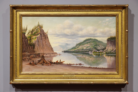 The gallery opens with two landscapes paintings with similar settings: Mount Rainier, Bay of Tacoma – Puget Sound (1875) by Sanford Robinson Gifford and Mitchell's Point Looking Down the Columbia (1887) by Grafton Tyler Brown both portray the terrain of the Pacific Northwest, with majestic mountains towering in the distance and expansive waterways laid out beyond. The scenery juxtaposes with the role of Indigenous people in the paintings—in Wokoma's words, Indigenous people are considered to be "wild and remote," but even more than that, their role in the environment is significantly diminished. In both paintings, Indigenous people are pictured as diminutive and less than, with their faces blurred out and the focus being on the landscape over the people present on it. They're disregarded on their own land, despite Wokoma's note that land serves as both an origin story and a significant cultural element for many Indigenous groups. Clearly, landscapes weren't the paradigm of impartiality they masqueraded as. This dynamic sets the stage for the rest of the exhibit, which reclaims the role of Indigenous people and changes the position from which viewpoints are centered.