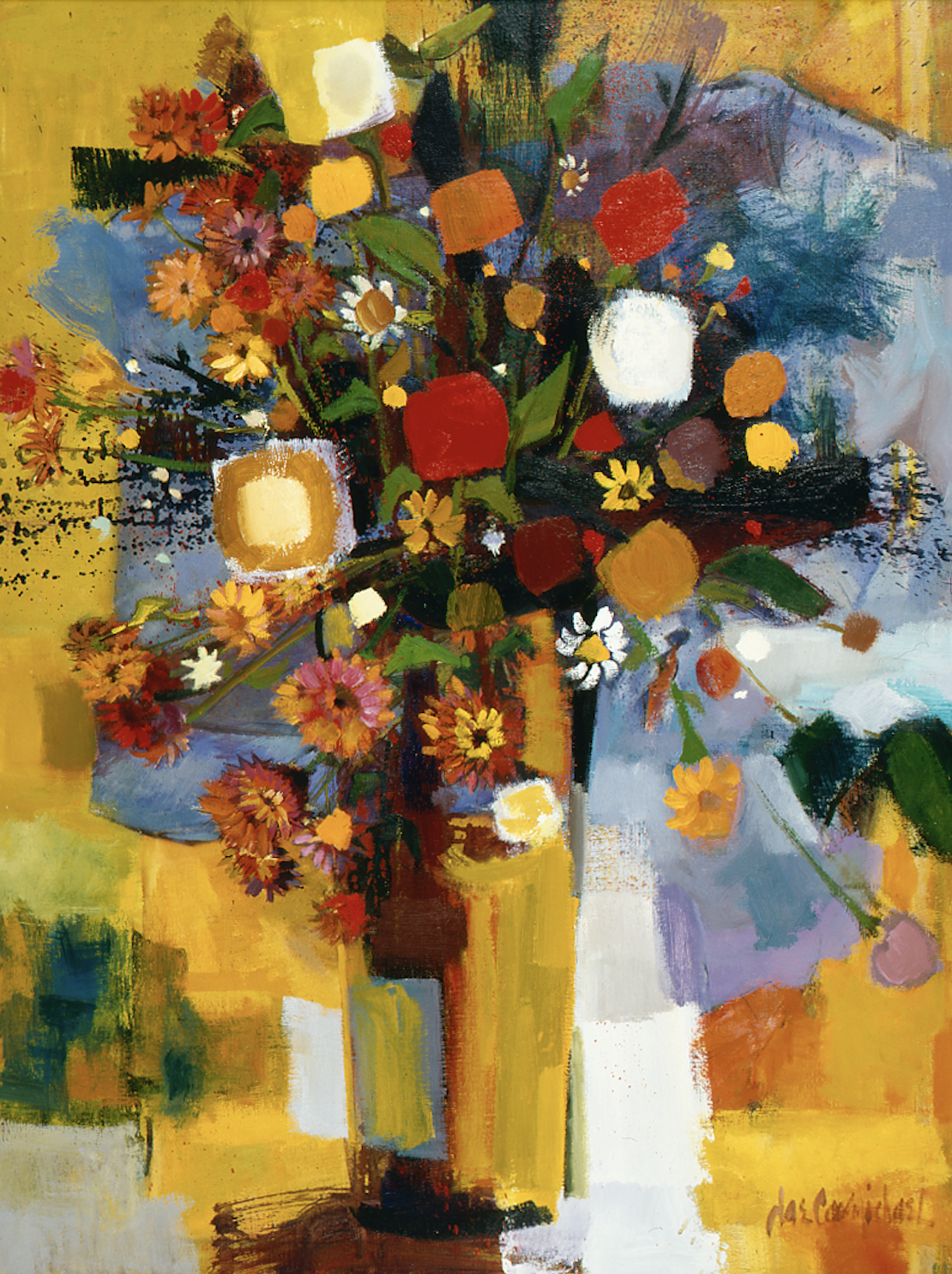 Wallflowers displays a wide variety of visual styles, spanning different artists and time periods, including traditional Dutch still lifes , impressionistic paintings, needle work, and computer distortions. From the Still Life With Tulips, a realistic classic still life depiction of a cactus and lilies, to the brightly colored, cubist Bouquet in Yellow Pot, no matter your artistic taste, you are bound to find something beautiful in the room.