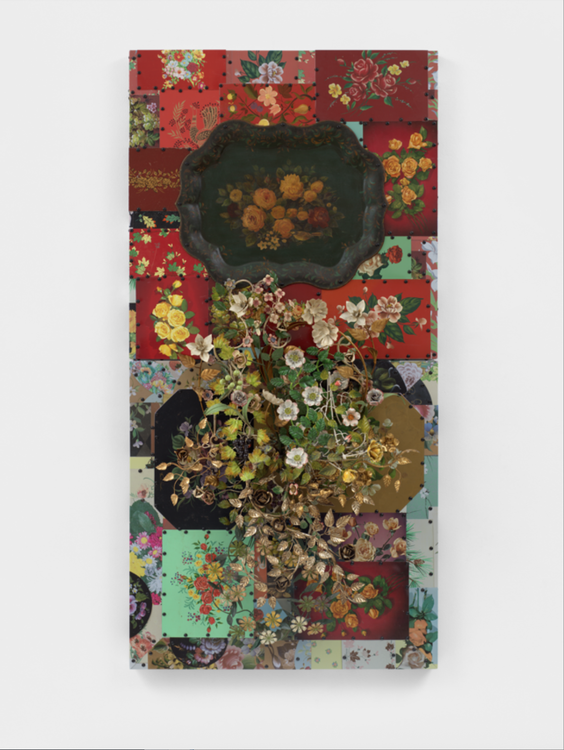 By the nature of different time periods and perspectives of the artists, Wallflowers comments on a variety of themes, as well as displaying a variety of visuals. Grapht, which stood out to me for its use of metal, combines floral-decorated serving trays into a beautiful sculpture, reflecting on the decorated but laborious lives of domestic workers. Full Blown fills a small canvas with bursting red flowers concealing a painting-within-a-painting nude, that evokes a strong sense of passion and feeling. Some of the oldest still lifes in the exhibit include flowers, both rotting on the table and propped up on a vase, expressing the transience of life and beauty. One of my biggest takeaways was just how many things can be said with a flower. The vastly differing messages and topics create an overall impression that the natural world connects with every aspect of human life. Even the works designed with computers, which some might say is the furthest thing from nature, connects with and depicts it.