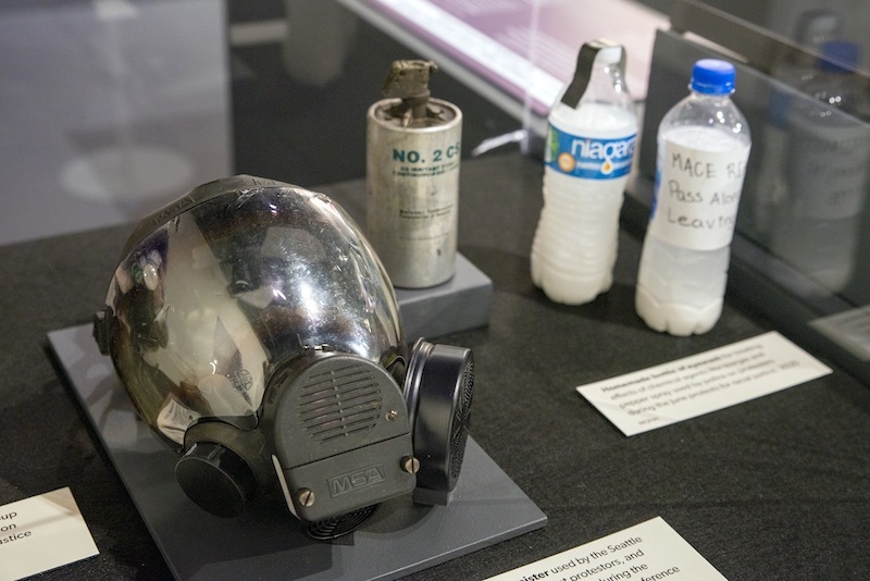 The doorway into Stand Up Seattle is the viewer’s first immersion into the interactive atmosphere of the exhibit. A walkway that surveys the visitor’s involvement in democracy ensures that visitors of all ages will have an immensely fun time going through the interactions. The entirety of the exhibit is displayed in the national—and very patriotic—red, white, and blue. The exhibit has a wide array of artifacts, such as a harpoon head from the Makah tribe’s whaling culture in the 1800s, to Pride T-shirts from recent protests, which are displayed throughout the exhibit. Materials used in Seattle protests were also shown to the public. It was an unsettling experience to see a spent tear gas canister, gas masks, and bottles of eyewash all right next to me. By displaying these objects that were key parts of protests, the exhibit attempts to accustom visitors to vital social justice history in Washington. It brings a nuanced depiction to marches and protests we may have only visualized in our heads or seen on our screens, humanizing the protesters that were on the streets fighting for their rights.