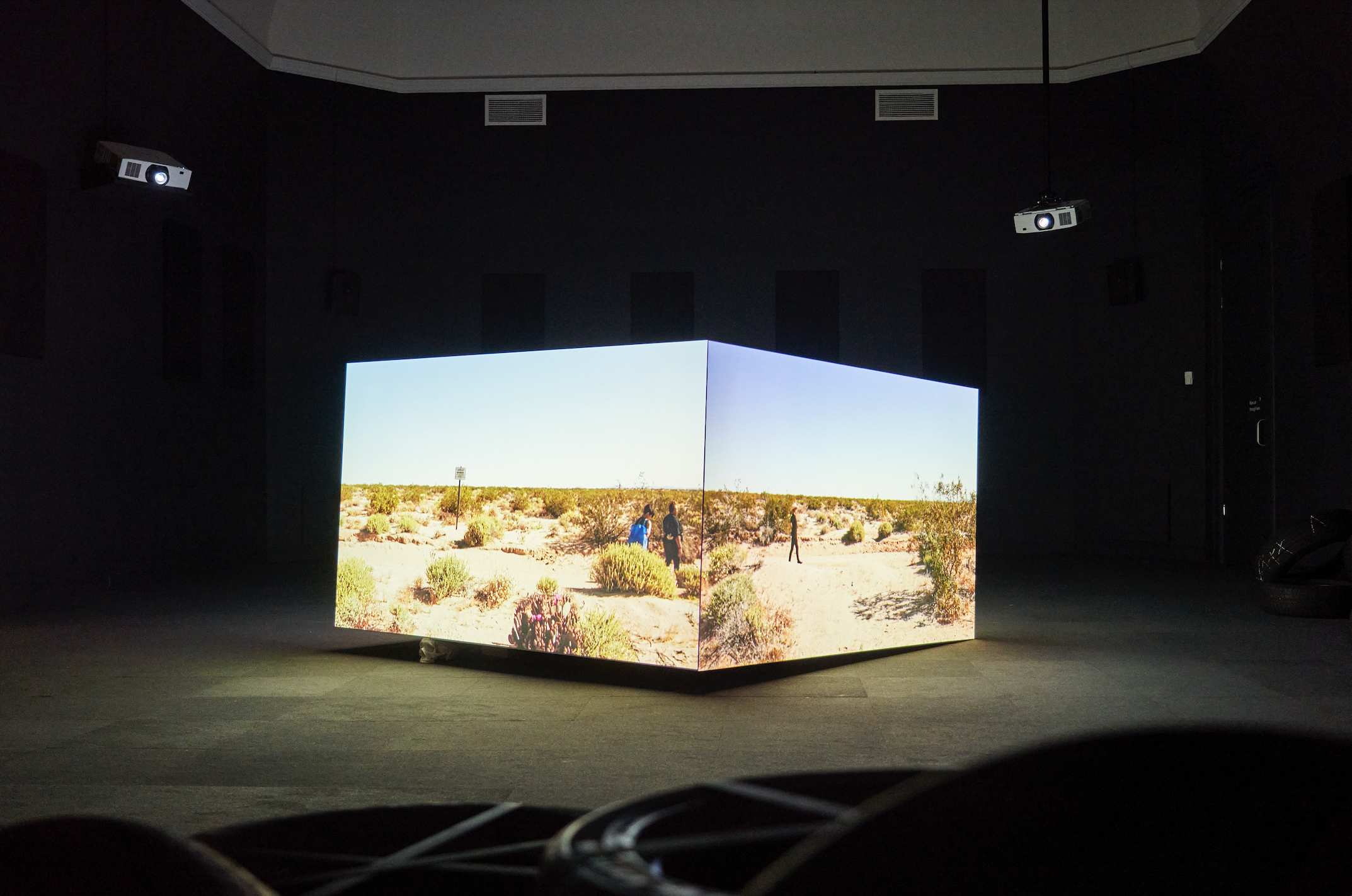 That very video work, however, is far different, and far more cryptic. The largest room in the exhibit is an expansive black space centered by a cube, sat at a slight diagonal in the middle. Burns’ films are projected onto each side of the cube; credits are hidden on the top side. Visitors sit against the walls to watch. Their neighbors are piles of tires, which sets an industrial tone for the film. Among the many short films Burns projects onto the cube are: a hazmat suited-man in a glowing purple room vacuuming smoke; ‘80s video game-esque graphics giving way to an isolated arch of speakers; and a group of mystery, partially-clothed desert-goers arrange dilapidated furniture and building materials into the perfect position.