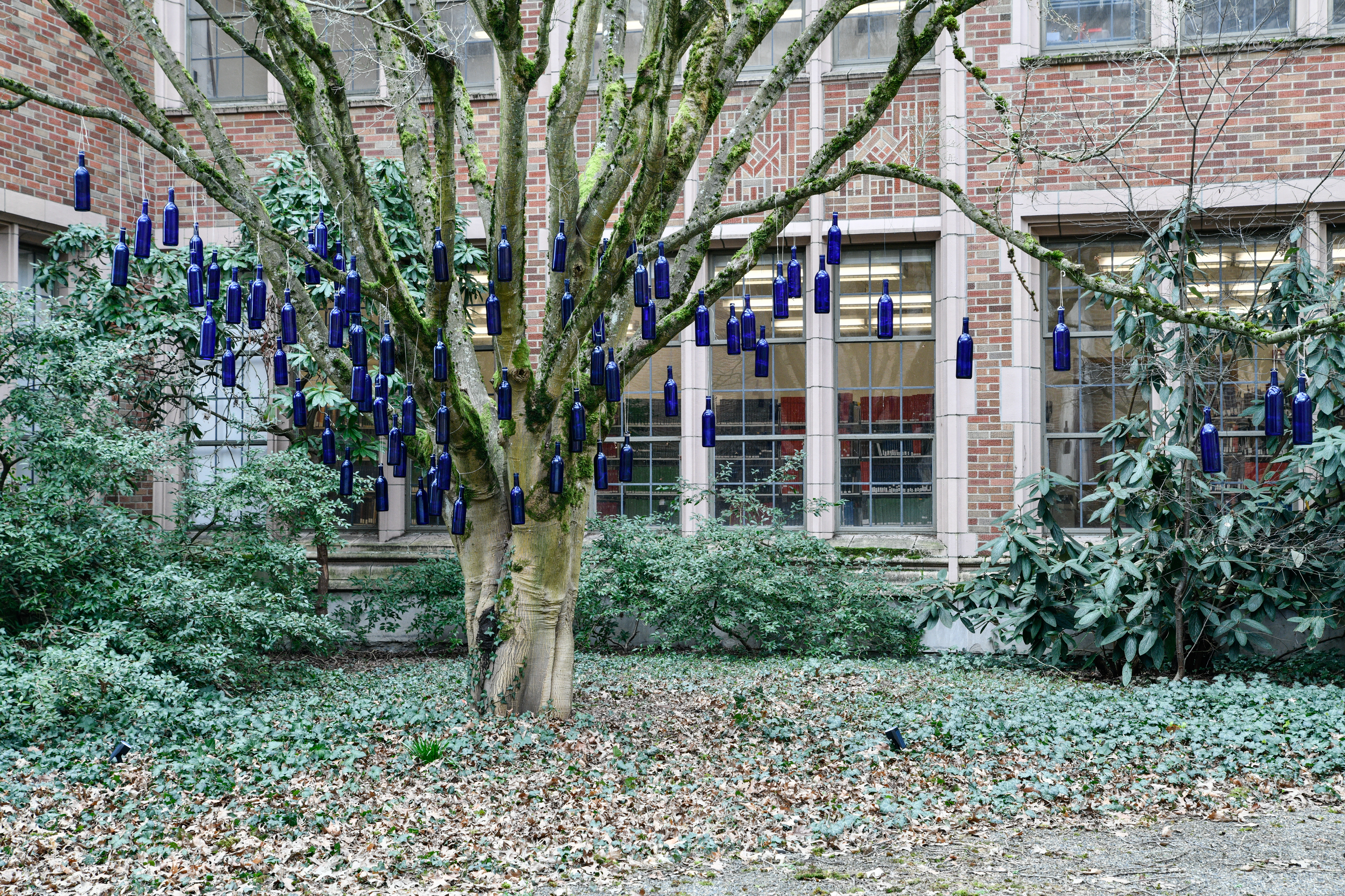 The exhibit draws audiences in from a nearby courtyard, where blue glass bottles hang down from the branches of two trees facing each other from opposite ends of the space. According to allegra’s artist statement, the bottles intend to “capture troubled spirits.” As I walked between the trees, I felt an eeriness. The area was nearly empty, while the dark colors swaying on either side of me created a weight that absolutely established the feeling of troubled spirits roaming about. And yet there seemed to be a layer of beauty at play, like a simple meditative serenity in the silence. The atmosphere establishes a clarified headspace that preps you efficiently for the poetry ahead.