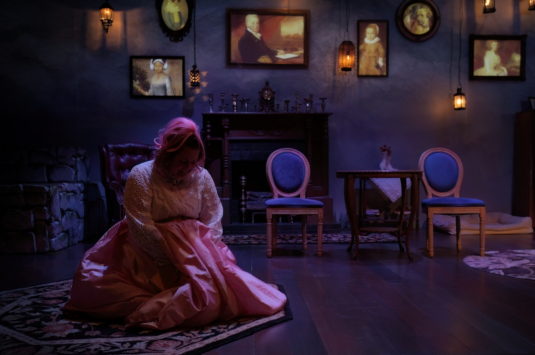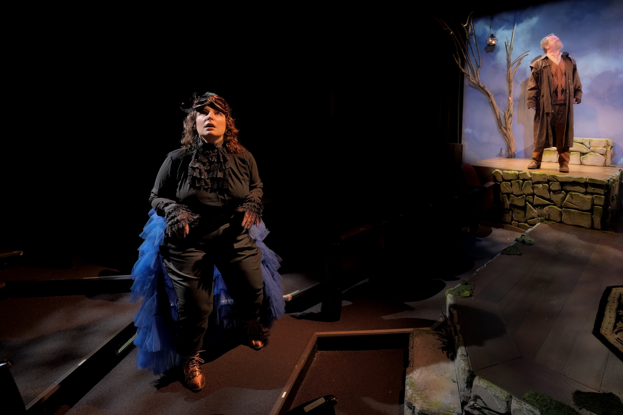 The characters are children of the Moors, reflecting their nature. The officious, imposing, and often cruel Agatha (Lisa M. Viertel) runs the household with an iron fist. She barks more than the mastiff, and she’s as dark and uncompromising as the Moors themselves. In contrast, bubblegum pink-wearing little sister Huldey (Megan Ahiers) might pass for sweet— if you can ignore her desperate loneliness, her main character complex, and her delusions of fame. Beyond the sisters, the cast is comprised of four other characters: the three identical maids (Kiki Abba), who at any moment may have typhus, a baby, or both; the philosophizing, droopy-eyed mastiff (Peter Dylan O’Connor), whose plaintive baying to God is equal parts comedic and depressingly nihilistic; the moorhen (Alyssa Keene), whose hatred of crash-landing is only matched by her need to soar; and the new governess, Emilie (Hazel Rose Gibson), the only one untouched by the Moors’ fanged influence… for now.